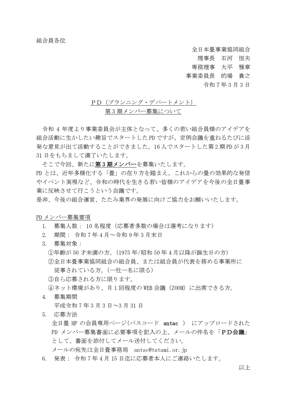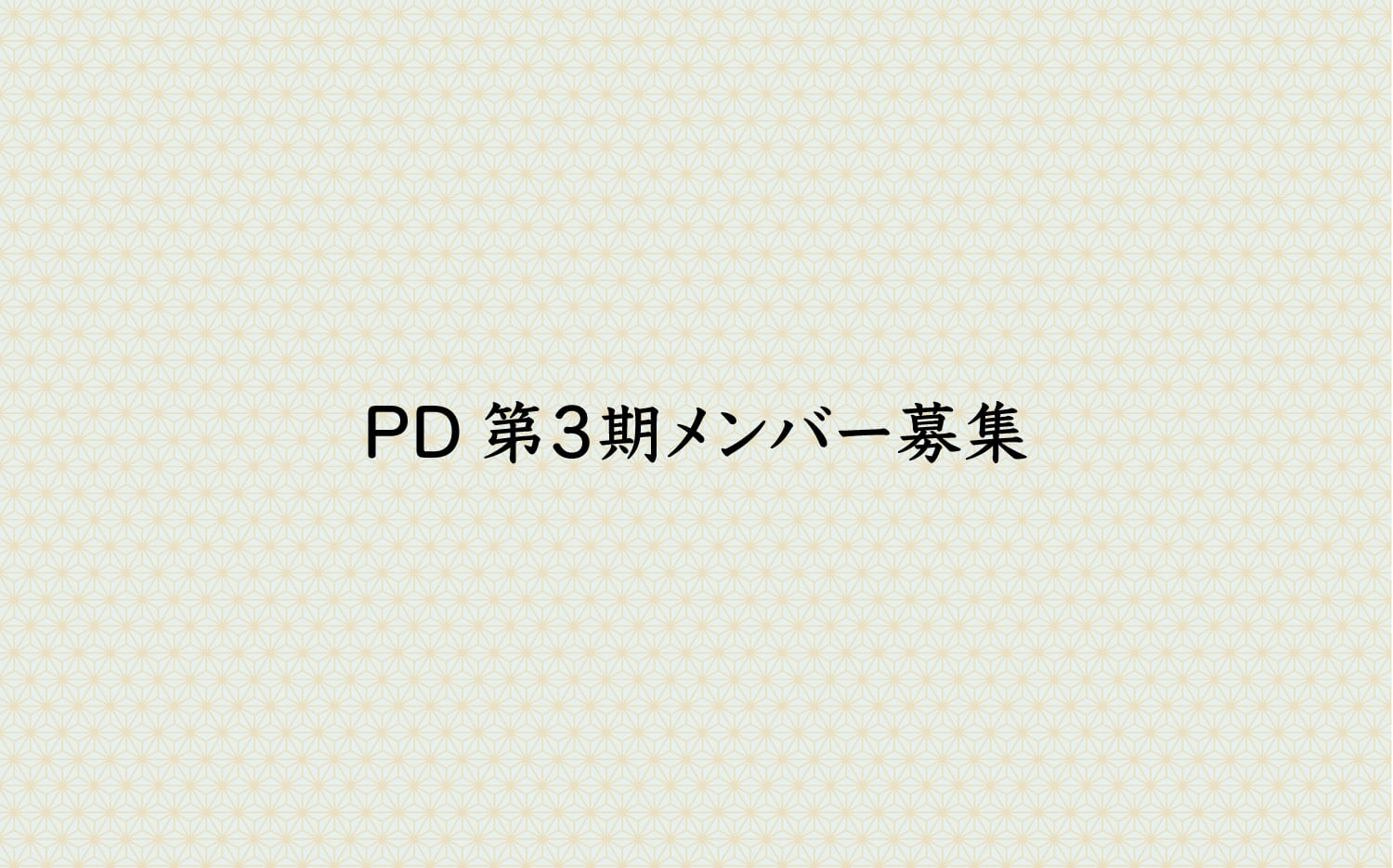 PD第3期メンバー募集 PD募集 2025.03.03 2025年3月3日(月) PD第3期メンバー募集 資料は下記よりダウンロードいただけます。(PDF) PD第3期メンバー募集案内-PDF Word申込みフォーム