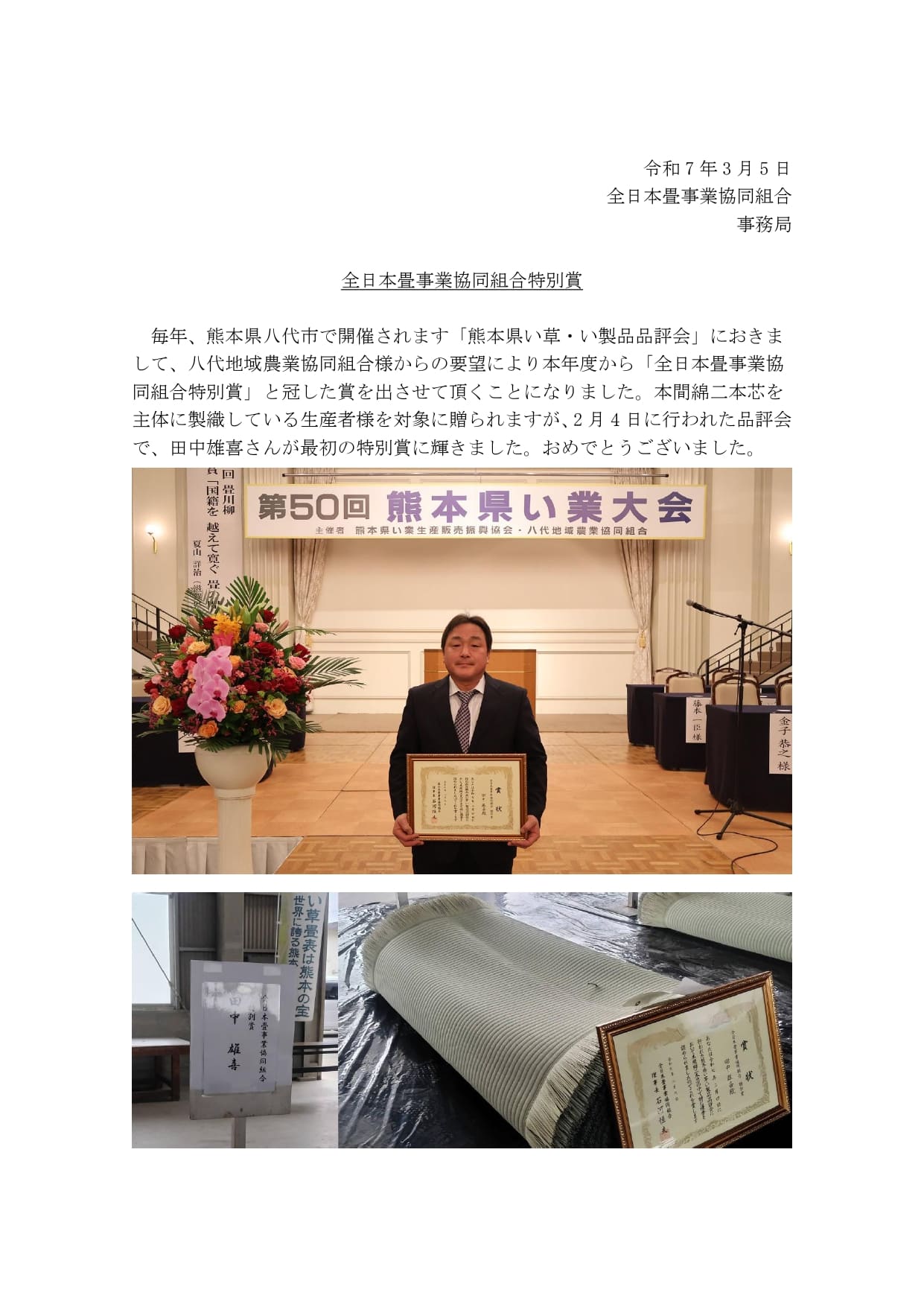 平成7年度熊本品評会特別賞 品評会・畳表 2025.03.05 2025年3月5日(水) 平成7年度 熊本品評会特別賞 資料は下記よりダウンロードいただけます。(PDF) 平成7年度熊本品評会特別賞-PDF