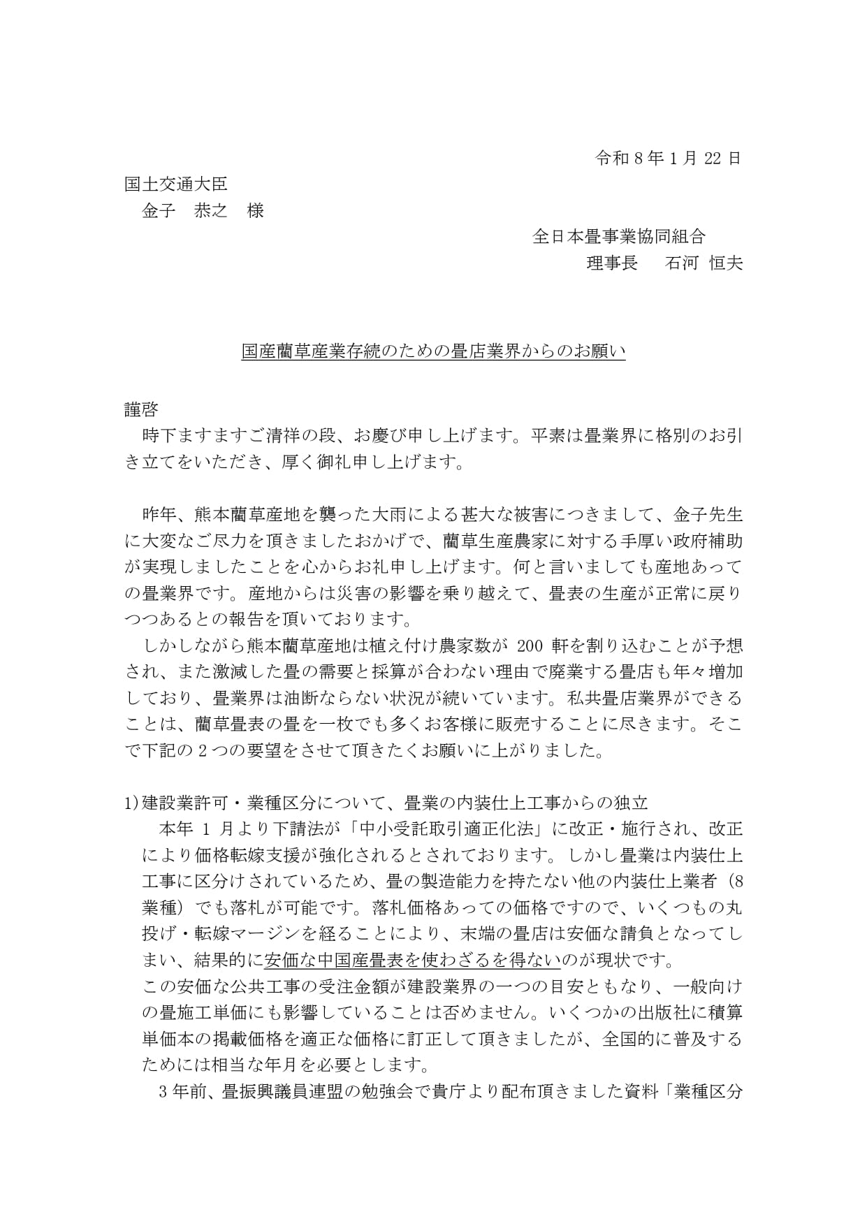 国土交通大臣国土交通省有村治子参議院議員畳振興議員連盟自民党総務会長金子恭之衆議院議員